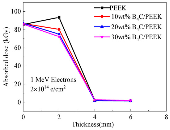 The smaller the absorbed dose measured in the experiment, the better the electron radiation protection effect of the composite material being tested. Figure 6 shows the absorbed dose distribution curves of the B4C/PEEK composites with different B4C addition amounts along the depth of the film dosimeter under electron irradiation. It can be observed that the absorbed dose of the PEEK material’s thin film dosimeter is higher than that of the surface dosimeter at a depth of 2 mm. This difference occurs because 1 MeV electrons penetrate the dosimeter and the material at a depth of 0mm, while the electrons in PEEK materials have a range of about 2 mm, allowing the deposited energy to accumulate in the PEEK material. Therefore, with changes in electron energy upon entering the material and the generation of secondary particles, an increase in dose occurs at the depth of 2 mm.