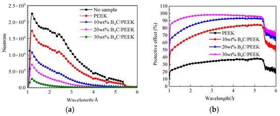 According to Equation (2), the relationship between flight time and neutron counts can be transformed into the relationship between neutron wavelength and neutron counts, as shown in Figure 8. In Figure 8a, the neutron counts versus wavelength relationship for B4C/PEEK composite materials with different B4C addition levels are illustrated, while Figure 8b displays the relationship between protection effectiveness and wavelength. From the graphs, it can be observed that PEEK material exhibits some level of neutron protection effectiveness. After incorporating B4C reinforcing components, the neutron protection effectiveness of the composite material significantly increases, with greater addition amounts resulting in better neutron shielding. When the B4C addition level reaches 30 wt%, the neutron counts of the sample approach zero for neutron wavelengths greater than 3.1 Å.