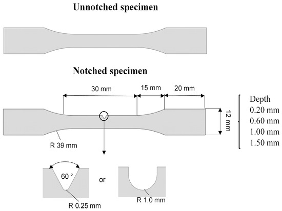 Over the past few decades, studies have delved into the notch effect in polymers employing a variety of experimental methods, including holographic interferometry [4], photoelasticity [5], and digital image correlation (DIC) [6,7], as well as analytical/numerical solutions (i.e., fracture parameters [8], William’s equations [6,8], and finite element analyses (FEA)) [8]. However, these studies have utilized nonstandard notches under specific elastic or elastoplastic monotonic conditions [9,10,11]. Indeed, there is currently no consensus in the literature regarding whether specimen and notch geometry is sustainable for accurately assessing the notch effect in the mechanical behavior of polymers.