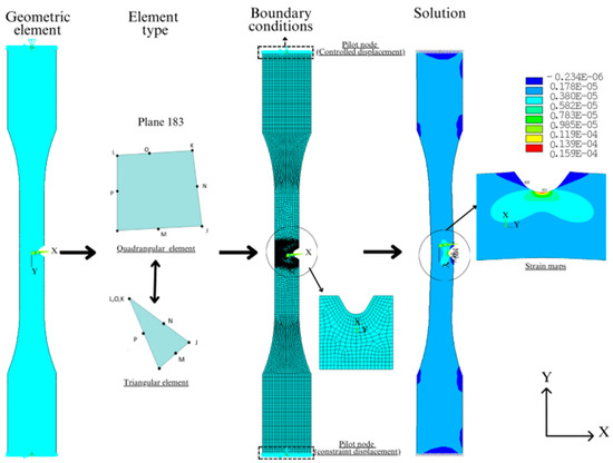 In this study, a finite element (FE) model was employed to simulate the behavior of notches in PVDF samples subjected to monotonic tensile tests. The FE model was two-dimensional (2D), representing the geometry of the tested samples, and was developed in ANSYS® [27]. As several FE meshes were employed in this study, their construction was automatized in a macro written in APDL (ANSYS Parametric Design Language), allowing their pre-processing, solution, and post-processing.