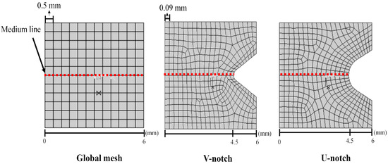 Figure 4 shows a close-up view of the mesh configuration used in the FE model. As a result of the high stress at the notches’ tips, an unstructured refined mesh was adopted in the vicinity of the notch neighborhood (V-notch or U-notch), whereas a coarser structured FE mesh was constructed following the specimen geometry in regions far from the notches. Moreover, the red dashed line corresponds to the medium line on which the strain values were extracted for later comparison with DIC results.