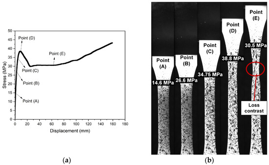 Illustrations (a) stress versus time with (b) images during tensile test using DIC to specific points: (A) stress at the linear–elastic region, (B) stress at 3.5% of strain, (C) stress at 7.0% of strain, (D) stress at the yield point, and (E) stress at necking.