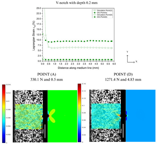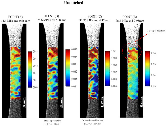 The DIC analysis was conducted in the notched specimens to assess the nucleation of the plastic zone at the notch tip, where damage was presumed to be significant. For comparison purposes in this study, the reference points are the same used in Figure 8. Then, the maximum strain measured was carried out up to the strain near the notch region to reach the yield strain to the unnotched specimens (Point (D) ~16%).