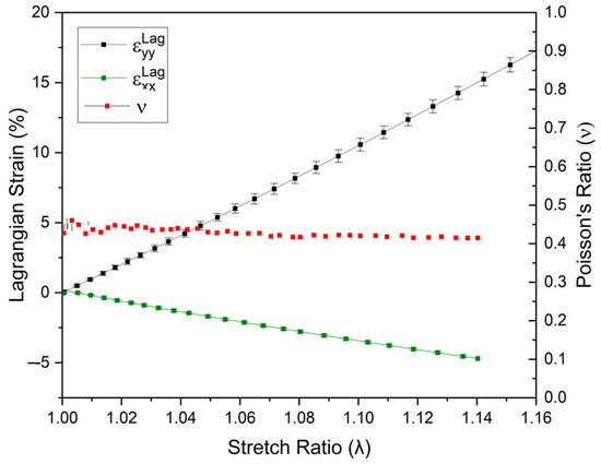 Poisson’s ratio (v) and longitudinal () and transversal () strains obtained using the DIC at different stretch levels until the yield point for the unnotched PVDF specimen.