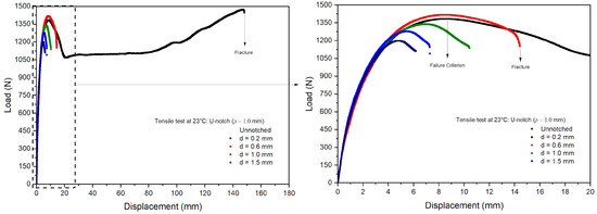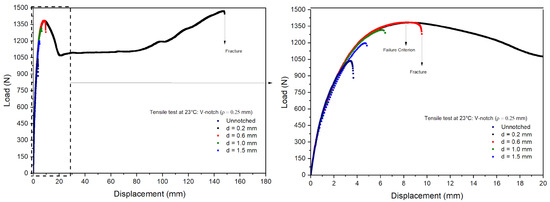 Tensile tests were performed on the notched specimens of PVDF under the same conditions as the unnotched tests. Figure 10 and Figure 11 show the measured load vs. displacement curves, evidencing nonlinear responses in all the notched specimens. The curves obtained for the notched specimens were close to the unnotched ones up to the associated failure loads. However, the failure loads of the notched specimens were lower than those observed in the unnotched specimens, and a significant decrease was also observed with an increase in notch depths. The failure of the notched specimens is related to stress concentrations around the notch root, causing local plastic deformations and the rupture of the specimens. As a result, the PVDF ductility perceived in the unnotched tests was significantly reduced, as observed, e.g., in polyolefins [37].