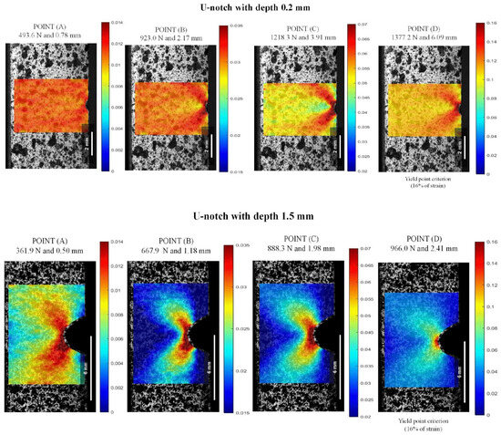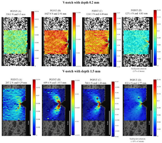 As illustrated in the strain maps for the V-notch sample (Figure 12), increasing the notch from 0.2 to 1.5 mm led to a significant intensification of local stress concentration compared to the unnotched specimens. At a depth of 0.2 mm, the specimen presented a discrete local stress concentration, indicating displacements of 2.91 mm at 1027.8 N for Point (B) and 2.83 mm at 1240.3 N for Point (C). On the other hand, as the depth increased to 1.5 mm, the strain at the notch tip showed a local strain more spread out from the notch with a butterfly wing format (BWF), resulting in a reduction of around 35.0% for displacement and 59.5% for load, concerning 3.5% (Point (B)) and 7.0% (Point (C)). The increase in local strain concentration occurs because the elastic bulk material severely constrains the plastic deformation zone ahead of the notch for all strain fields. As a result, the area far from the defect zone experiences lower and more uniform deformation values [1,9]. This pattern was also observed in the U-notch specimens in Figure 13, where there was around a 49.3% decrease in displacement and approximately 27.6% decrease in load at Point (B) and Point (C) from 0.2 to 1.5 mm depth.