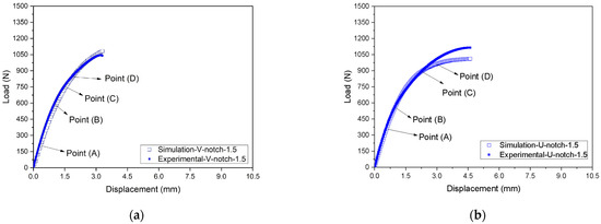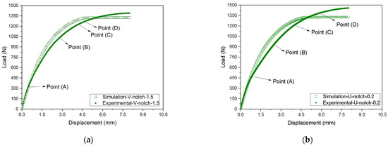 Figure 14 and Figure 15 and Table 5 compare the experimental and simulated load–displacement curves for both types of notches at all depths and considering the points indicated in Figure 8. The numerical model well captured the global behavior of the notched specimens. The numerical curves followed the experimental ones until reaching a plateau, indicating the samples’ rupture. As the notch depth increased, the displacement associated with the beginning of the plateau was also reduced. For instance, V- or U-notches with a 0.2 mm depth had a plateau starting around 4.6 mm displacement, while for a 1.5 mm depth, the plateau began at about a 3.0 mm displacement. The difference between the experimental and the FE results during failure may be attributed to how the defect (notch) develops and propagates during the experimental tests and the FE analyses. In the experimental tests, the defect propagated and tore the samples with the increasing imposed loads. Instead, the FE mesh remained continuous throughout the analysis, and no gaps (or voids) were initiated. Hence, the actual rupture of the material, which would demand the discontinuity of the FE mesh, was not modeled. Still, the increasing acting strains progressively reduced the element stiffness to simulate the sample’s failure. This approach modifies the stress field close to the notch tip, particularly given the constraint caused by a sharp curvature radius, possibly altering the failure mechanism development. It is recognized that this is a limitation of the proposed approach that should be investigated in future studies.