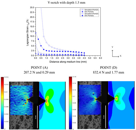 In the prediction of localized deformations, Lagrangian strains were extracted along the Y-axis from the notch tip for both DIC and FEA, as illustrated in Figure 4. Figure 16, Figure 17, Figure 18 and Figure 19 show the corresponding results at Point A (the load associated with the elastic region) and Point D (the load related to the yield point criterium), in which the region near the notch tip presents values of higher deformation.