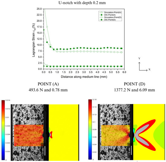 Comparison between DIC technique and FEA at Point A and Point D for U-notch tip with 0.2 mm depth.