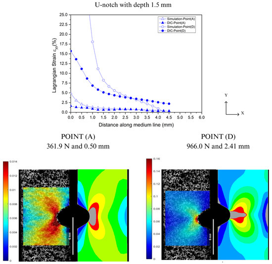 Comparison between DIC technique and FEA at Point A and Point D for U-notch tip with 1.5 mm depth.