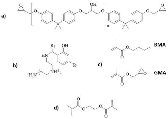 Chemical structures of: (a) DGEBA; (b) phenalkamine; (c) BMA and GMA; and (d) EGDMA.