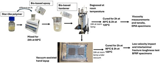 Low-velocity instrumented puncture tests specimens were fabricated according to ISO 6603-2 [] with dimensions of 60 × 60 × 1 mm. Two different star-like polymer contents, 0.5 and 1 wt.%, were chosen to be reinforced with basalt fibres. The laminates were fabricated by hand-layup and five layers of basalt fibre were used to achieve a thickness of 1 mm. The specimens were vacuum bagged for 12 h and the above-mentioned curing cycle was followed. At least five specimens were fabricated and tested. Only two contents were chosen for the modification of BFRP laminates as significant results were not seen on the addition of 0.25 wt.% in the bio-based matrix. The overall process of materials’ and specimens’ preparation is presented in Figure 4.