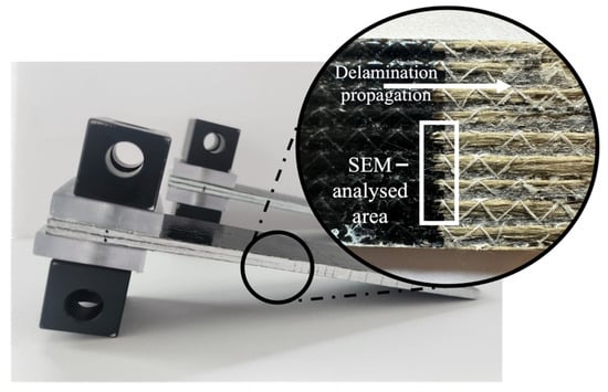Scanning electron microscopy (SEM) (S-3400N, Hitachi, Tokyo, Japan) was performed using a BRUKER Quantax EDS detector in high vacuum mode on the BFRP laminates from the interlaminar fracture toughness test. A section of the interface where delamination initiates was chosen (Figure 5) to visualise the failure behaviour.
