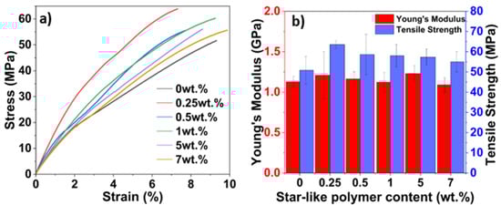 Tensile test results: (a) stress-strain curves; (b) tensile strength and modulus of the bio-based matrix with different contents of star-like polymer.