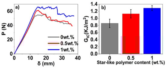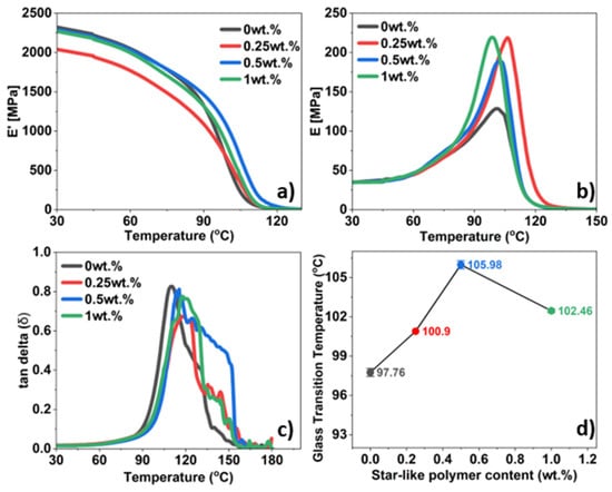 The incorporation of 0.5 wt.% of star-like polymer resulted in an 8.2 °C increase in the glass transition temperature (from 97.8 °C to 106.0 °C), indicating improved retention in stiffness of the matrix material at higher temperatures.