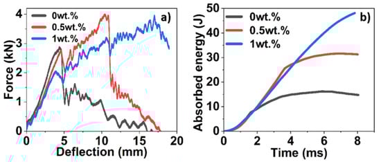 Low-velocity impact tests: (a) contact-force vs. deflection; (b) absorbed energy of BFRP modified with different contents of star-like polymer.