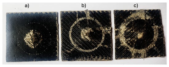 Images of specimens post-impact: (a) neat epoxy; (b) 0.5 wt.%; (c) 1 wt.% of star-like polymer.