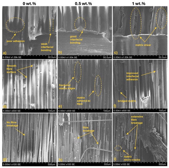 Fractured specimens from the interlaminar toughness tests were further analysed using SEM. The interface of the delamination initiation was chosen as the area of focus to assess the initiation of matrix breakage, fibre pull-out, fibre bridging, and crack propagation. Figure 12 depicts the damage morphology of the BFRP laminates at different magnifications for neat, 0.5, and 1 wt.%-modified bio-matrix. At 1000× magnification, the interface between the fibre and matrix can be analysed closely. For neat epoxy specimens, clear incohesive zones are visible with gaps present between the fibre and matrix owing to poor interfacial bonding (Figure 12a). With BFRP laminates modified with 0.5 wt.% star-like polymer, an improved interface between the fibre and matrix is observed. No spaces can be discerned (Figure 12b). In BFRP laminates modified with 1 wt.%, excellent adhesion between the fibre and matrix is noted (Figure 12c). Extensive matrix shearing along the fibre depicts elastic deformation of the matrix while maintaining interfacial bonding with the fibre.