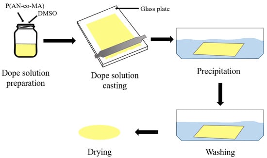 The phase inversion method is the most common technique for the preparation of asymmetric polymeric ultrafiltration membranes. The phase inversion methods include vapor-induced phase separation (VIPS), thermally induced phase separation (TIPS), evaporation-induced phase separation (EIPS), and immersion precipitation or non-solvent-induced phase separation (NIPS). Among these techniques, NIPS is the most commonly employed technique for the preparation of asymmetric polymeric membranes including PAN membranes []. In this work, membranes were prepared by the NIPS, with water as a non-solvent (Figure 1). The polymer solution was applied onto acetone-cleaned polished glass using a doctor blade to form a layer with a thickness of 200 µm at a temperature of 20 °C and humidity of 20%. The glass with the applied solution was then quickly immersed in distilled water. After the membrane formation was completed, the samples were transferred to a washing bath filled with distilled water and left for 24 h. The membrane was then placed in ethanol for at least 24 h, followed by an additional 24 h in isobutanol (Chemically Pure, Khimmed, Russia) to prevent pore collapse during drying. After the isobutanol treatment, excess liquid was removed from the membrane using filter paper, and the membrane was left to dry completely at room temperature and 20% humidity in a fume hood, positioned between two sheets of filter paper.