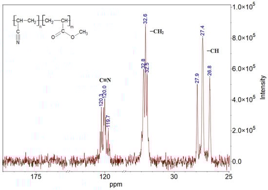 The P(AN-co-MA) was characterized using 13C NMR spectroscopy (Figure 2). The sample was dissolved in DMSO-d6. The broad peak in the range of 26.8–27.9 ppm is attributed to the carbon resonance of the −CH groups of acrylonitrile and methyl acrylate units. The signal associated with the methylene carbon of both comonomers appeared at 32.5–32.8 ppm. Additionally, peaks in the region of 119.7–120.3 ppm were assigned to the carbon in the nitrile group. However, the spectrum lacked the signal associated with the presence of the methoxy group in methyl acrylate, which should be located around ~176 ppm. This could be due to the low concentration of the polymer in the deuterated DMSO solution.