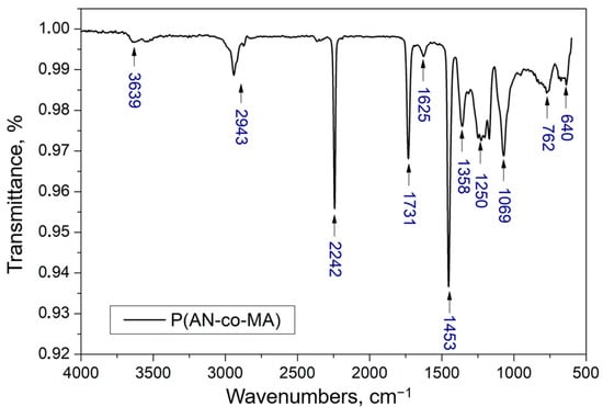 The chemical structure of the polymer was further investigated by Fourier-transform infrared (FTIR) spectroscopy (Figure 3). The IR spectrum shows a characteristic of valence vibrations of the nitrile group C≡N at 2242 cm−1, which corresponds to the acrylonitrile monomer units. The intense band at 1731 cm−1, associated with the carboxyl group C=O, and the broad band at 1250 cm−1, related to C−O−C vibrations in esters, confirm the copolymerization of the initial AN and MA monomers. The near absence of the band at 1625 cm−1, which characterizes the C=C double bond stretching vibrations, as reported in previous studies [,], indicates that the copolymerization process was achieved through the breaking of double bonds in both AN and MA monomers [].