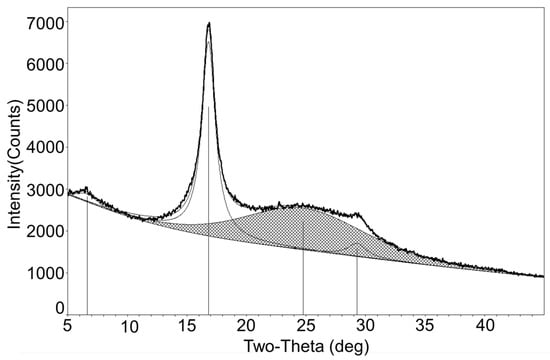 The XRD analysis of the P(AN-co-MA) shows that the most intense peak is observed at 2θ = 16.79° (Figure 4), which corresponds to the (100) plane of the hexagonal lattice of the polymer. The second peak, corresponding to the (101) plane, is observed at 2θ = 29.43° []. The degree of crystallinity was calculated as the ratio of the areas of the “crystalline” peaks to the total peak area, which was 45%.