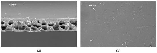 The analysis of the SEM image of the membrane cross-section showed that the membrane had an asymmetric structure with cellular macrovoids and a thin surface skin layer (Figure 6a). The thickness of the P(AN-co-MA) skin layer was approximately 6 μm. The SEM image of the surface showed no significant defects, and the surface pore size of the skin layer was substantially below the resolution limit of the used method (Figure 6b). On the other hand, according to liquid–liquid porometry data, the average pore size of the membrane was 23.1 nm, with the largest pore size being 73.4 nm and the smallest one 16.2 nm. The porometry results of transport pores in the membrane also confirmed the absence of significant defects in the membranes.