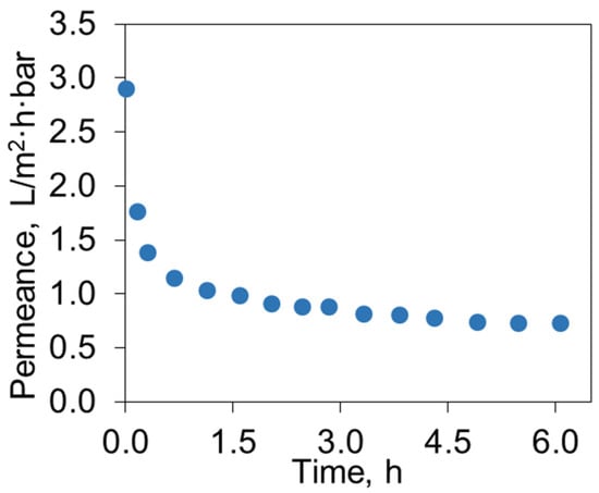Filtration of a 100 g/L used engine oil solution in toluene was carried out for 11–13 h to obtain the required volume of permeate (Figure 7). Upon transitioning from toluene to oil solutions, a sharp decline in permeability was observed within the first 70 min, followed by a gradual decrease in permeance because of fouling. The permeance of the UEO solution in toluene (0.75 L/(m2·h·bar) at 25 °C) was higher than the permeance of waste lubricant oil through a PAN ultrafiltration membrane at 40 °C (~0.1 L/(m2·h·bar)) without dilution [].