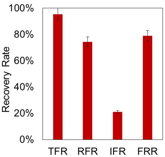RFR represents the reversible portion of the flux decline, indicating the extent to which the flux of the pure solvent through the membrane fouled as a result of filtration (J2) exceeds the flux of the solution. This parameter reflects the contribution of reversible factors to the overall fouling, such as concentration polarization and gel layer formation. The RFR was calculated as follows [,]: