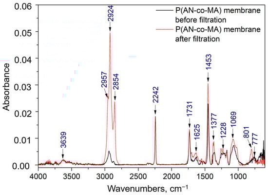 To confirm membrane fouling, we studied the membrane surface before and after filtration of the UEO solution in toluene using FTIR spectroscopy (Figure 9). The FTIR spectra of the membranes before and after filtration contain all the characteristic bands of the P(AN-co-MA) polymer: stretching vibrations of C-H are observed in the 2950–2850 cm−1 range, the nitrile group (C≡N) at 2242 cm−1, C-H deformations at ~1453 and 1377 cm−1, mixed C-H and wagging CH2 at ~1069 cm−1, weak absorption bands at 1228 and 777 cm−1, stretching vibrations of C=O at 1731 cm−1, and mixed C-O stretching and deformation vibrations from C=O and C-O in the 1250–1000 cm−1 range from methyl acrylate []. The band in the 3700–3600 cm−1 range characterizes the O-H group, indicating residual water or alcohol on the membrane surface, which was also observed in the FTIR spectrum of the polymer.