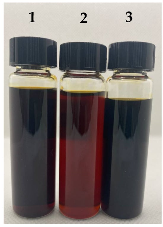 For further analysis, it was necessary to remove all the toluene from the permeate using distillation. The toluene distillation was carried out on a Hei-VAP Core rotary evaporator (Heidolph Instrument, Schwabach, Germany) with a vacuum pump and a trap cooled with liquid nitrogen. The bath temperature was 90 °C, the flask rotation speed was 14 rpm, and the mixture volume was 600 mL. The distillation process continued until the permeate boiling ceased, and all the toluene was collected in the receiving flask. About 60 mL of filtered oil was obtained at the outlet. Toluene distillation was also performed for the retentate using the same method.