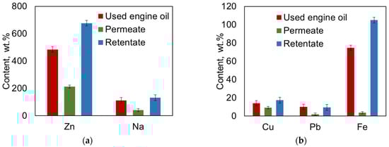The metal content in UEO and filtration products (permeate and retentate) was investigated using inductively coupled plasma atomic emission spectrometry (AES) (ICPE-9000, Shimadzu, Kyoto, Japan). The method is based on measuring the emission intensity of atoms of the elements being determined, which occurs when the sample is sprayed into an argon plasma sustained by a radio-frequency electromagnetic field, and it requires preliminary sample preparation. The sensitivity of the AES method allows for the determination of element content from 10−5% to 100% with a relative error of ~15%. The sample preparation procedure involved weighing the test samples. The weighed sample was placed in a quartz beaker, treated with 0.1 cm3 of concentrated H2SO4, covered with a watch glass, and dried on a hot plate until a carbonaceous residue formed. The beaker with the samples was placed in a muffle furnace and burned at 500 °C for 5 h. After cooling to room temperature, the resulting ash was mineralized with a mixture of concentrated acids H2SO4 (1:2) until complete dissolution.
