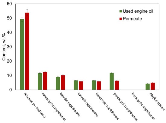 In [], three types of hollow fiber membranes—PES with a pore size of 0.1 µm, PVDF with a pore size of 0.1 µm, and PAN with the molecular weight cut-off (MWCO) of 50 kDa—were used to separate waste lubricant oil. Filtration was performed at 40 °C and 0.1 MPa. As expected, the PAN ultrafiltration membrane exhibited a higher degree of purification than the PES and PVDF microfiltration membranes. The rejection of the PAN membrane was 99.6%. Analysis of the retentate composition revealed that it mainly retained aromatic compounds, oxidation, and degradation products, as well as metal particles, carbon dust, etc.