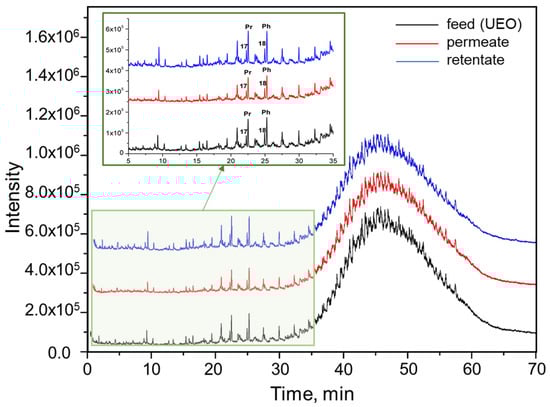 For the preliminary assessment of the composition of UEO, permeate, and retentate, gas chromatography coupled with mass spectrometry (GC-MS) was employed. Since UEO was quantitatively diluted with toluene before filtration, no additional sample preparation was required for GC-MS analysis. A Shimadzu GC-2010 Plus gas chromatograph with a mass spectrometric detector (MDGC/GCMS-2010, Shimadzu, Kyoto, Japan) was used. The column was SP-Sil 5 CB (100% polydimethylsiloxane), 30 m in length, 0.32 mm in internal diameter, and 0.25 µm in film thickness. The column thermostat program was as follows: 50 °C (2 min), 4 °C/min, 300 °C (40 min). The mass spectrometer operated in the mass range of 16–600 Da in full ion current mode, with the ionizing electron energy set at 70 eV. The composition of the initial UEO solution, permeate, and retentate was studied according to the methodology described earlier []. For this, the total intensities for each fragment ion were extracted from the obtained chromatograms of the samples, and calculations were performed as described below.