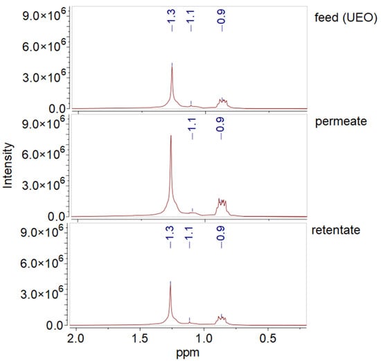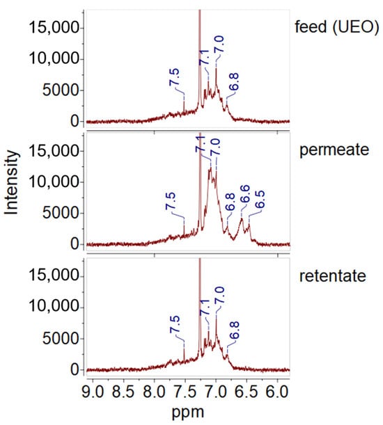 Further, the physicochemical properties of the initial UEO, permeate, and retentate were investigated. The main indicators characterizing possible changes in the composition of the samples are color, optical density, density, dynamic viscosity, and total acid number (TAN). Color determination was carried out according to the ASTM D1500 color scale [], and density was measured using hydrometers. This choice is explained by the fact that during the operation of engine oil, exposure to oxygen and high temperatures leads to the oxidation and degradation of its components, as well as to the polymerization and condensation of some products. As a result of aging processes, inert substances are formed, primarily alcohols, aldehydes, esters, ketones, asphaltenes, resins, and acidic substances, which cause corrosion and increased metal wear. The optical density was measured using a PE-5400UV spectrophotometer (PromEcoLab, Shanghai, China). Toluene was used as the reference solution. As the wavelength increased, the optical density of the solutions monotonically decreased. For the studied solution concentration of 100 g/L, this optical density was observed at a wavelength of 485 nm. Dynamic viscosity will indicate the degree of removal of undesirable components of used oil, including resin-asphaltene substances, during ultrafiltration []. TAN will provide information on the content of acidic substances in the initial mixture, and comparing this indicator in the investigated samples will show whether their removal is possible through the filtration process on P(AN-co-MA) membranes. The total acid number is determined by the potentiometric method according to ASTM D664 or D974 standards [,]. Measurements for each solution were carried out at a temperature of 22 °C. 1H NMR experiments were conducted for UEO and filtration products. Deuterated chloroform (CDCl3) was used as a solvent. Spectra were obtained using a Bruker AVANCE III HD 400 NMR spectrometer (Rheinstetten, Germany). To compare the spectra and qualitatively characterize the changes in composition, solutions of the same concentration were prepared: 20 mg/0.5 mL of solvent.