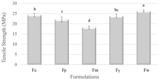 Tensile strength of samples prepared from corn (Fc), potato (Fp), cassava (Fm), yam (Fy), and wheat (Fw) starches. a–d Different superscript letters within the different columns indicate significant differences among formulations (p < 0.05).