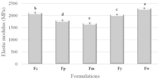 Elastic modulus of samples prepared from corn (Fc), potato (Fp), cassava (Fm), yam (Fy), and wheat (Fw) starches. a–e Different superscript letters within the different columns indicate significant differences among formulations (p < 0.05).