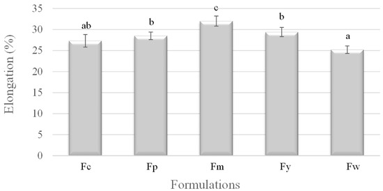 Elongation of samples prepared from corn (Fc), potato (Fp), cassava (Fm), yam (Fy), and wheat (Fw) starches. a–c Different superscript letters within the different columns indicate significant differences among formulations (p < 0.05).