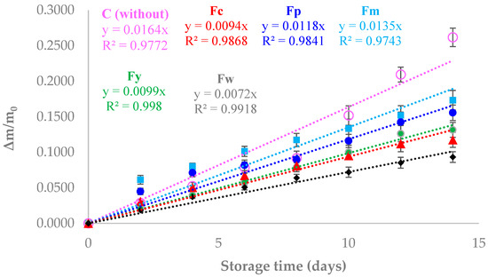 Figure 4 illustrates the weight loss of cherry tomatoes stored under 70% relative humidity at 30 °C for two weeks, comparing those coated with different starch films to uncoated tomatoes (control). The results showed that the tomatoes coated with starch films experienced significantly less weight loss compared to the control, indicating the effectiveness of these coatings in reducing moisture loss, which is critical for maintaining food quality and extending shelf life. Tomatoes without any coating (control) showed the highest weight loss, which can be attributed to the lack of a barrier preventing water evaporation. In contrast, tomatoes coated with the different starch films exhibited reduced weight loss, demonstrating that the films acted as a moisture barrier, slowing down the rate of water evaporation. This reduction in moisture loss is crucial, as it helps maintain the firmness, texture, and overall freshness of the tomatoes, directly impacting their marketability and consumer acceptance. Among the coated samples, those with higher amylose content, such as the Fw (wheat starch) film, showed the least weight loss. This can be explained by the denser and more crystalline structure of high-amylose films, which effectively restricts the passage of water vapor, thereby better preserving the moisture content of the tomatoes. On the other hand, samples with a lower amylose content, like Fm (cassava starch), displayed a slightly higher weight loss compared to Fw, but was still significantly lower than the control. The more amorphous structure of the low-amylose films, while still providing a barrier, was less effective at preventing moisture loss compared to the crystalline structure of the high-amylose films. Overall, the results indicate that starch films, particularly those with higher amylose content, are effective in reducing the weight loss of cherry tomatoes during storage by acting as a barrier to moisture loss. This suggests that such films could be beneficial as edible coatings to extend the shelf life of fresh produce by minimizing dehydration, thereby preserving food quality over time. Other authors have reported the same trend in different food products. In this regard, Thakur et al. [48] applied a coating of rice starch and carrageenan to bananas, achieving a 40% extension to their shelf life. They also reported a delay in ethylene production and the starch degradation rate during storage. Fakhouri et al. [49] reported a reduction in weight loss and an improved appearance after 21 days of refrigerated storage of Red Crimson grapes coated with starch/gelatin-based edible films. Pellá et al. [50] succeeded in extending the shelf life of guavas by up to 2 days with a coating based on cassava starch, gelatin, and casein. They attributed the increased shelf life to the low water vapor transmission rate of the films, which led to a reduction in the fruit’s mass loss. Similarly, Gómez-Contreras et al. [51] reported a reduction in weight loss in strawberries coated with yam starch-based films and essential oils stored at 25 °C and 85% RH for two weeks.