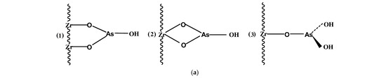 The enhanced removal of As(III) on Zr(IV) loaded on collagen fibres (CF) was explained by the ability of As(III) to form different configurations of complexes with zirconium-supported collagen fibres (Figure 2a): (1) bidentate, binuclear As(III) connects through oxygen with two zirconium ions; (2) bidentate, mononuclear As(III) forms two bonds with one zirconium ion via the oxygen ions; (3) monodentate, mononuclear As(III) creates one bond with one zirconium ion. This mechanism was similar to As(III) adsorption on alumina [60].