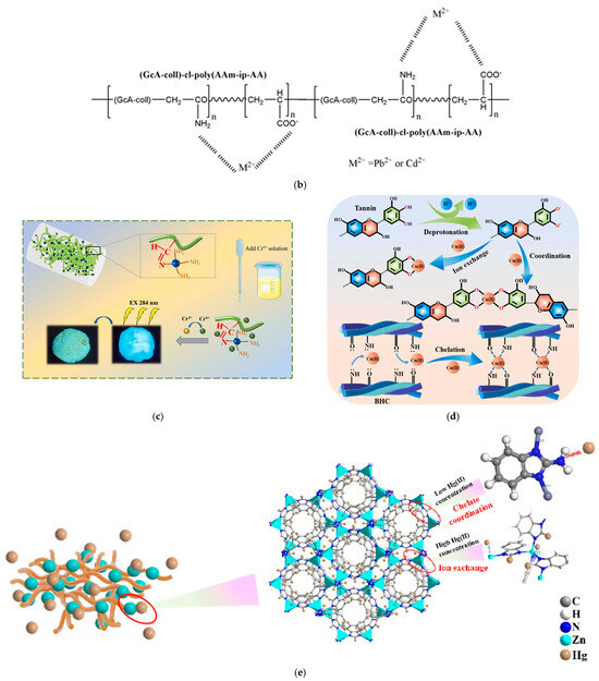Mechanisms of heavy metals and metalloids ions adsorption on collagen-based materials; (a);As(III) removal by Zr(IV)—loaded collagen fibre [60]; (b) Removal of Pb(II) and Cd(II) over gum copal-collagen hybrid adsorbent [45]; (c) Cr (VI) adsorption by collagen-based porous fluorescent aerogel [56]; (d) Cu(II) retention on bovine hide collagen/tannin extract composite (BHC/TE) [32]; (e) Hg(II) retention on amino functionalized collagen fibre combined with metal–organic frameworks (MOFs) [57].