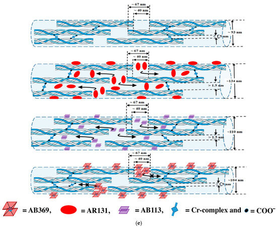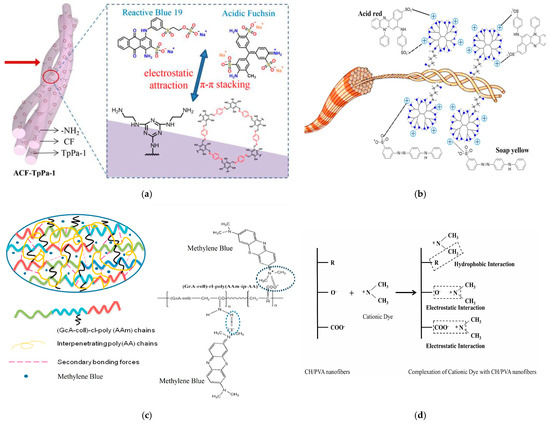 Mechanisms of dye adsorption over collagen-based materials: (a) Acid fuchsin and reactive blue 19 (anionic dyes) on composite COF (covalent organic frameworks)—aminated collagen fibres, abbreviated ACF-TpPa-1 [70]; (b) Anionic dyes (acid red and soap yellow) adsorption on multilayer ammoniated collagen fibres [38]; (c) Methylene blue adsorption on interpenetrating network hydrogel from (gum copal alcohols collagen)-co-poly(acrylamide) and acrylic acid [36]; (d) Cationic dye (methylene blue) adsorption on collagen hydrolysate (CH) crosslinked with polyvinyl alcohol (PVA) [37]; (e) Acid Brown 369 (AB369), Acid Red 131 (AR131) and Acid Blue 113 (AB113) removal by tanned bovine collagen fibres (TBCFs) [74].