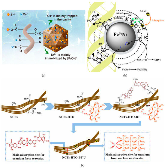 Mechanisms of radioactive ions adsorption: (a) Adsorption and subsequent separation of radioactive Cs+ and Sr2+ by zirconium molybdopyrophosphate-functionalized collagen fibres [85]; (b) Uranyl ions adsorption over nano-zero-valent Fe/Ni particles (NZFNP) loaded on collagen fibres [86]; (c) Uranium extraction from seawater vs. removal from wastewater NCFs—nano collagen fibrils, HTO—hydrous titanium oxide, BT—bayberry tannin [81].