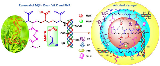 Mechanisms for simultaneous removal of heavy metals (Pb(II) and Hg(II)), dyes (methyl violet, MV; methylene blue, MB), vitamin C and p-nitrophenol (PNP) by carbohydrate and collagen-based doubly grafted interpenetrating terpolymer hydrogel (AMPA-3-acrylamido propanoic acid) [2].