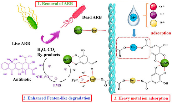 | 13. | AgNPs/Fe crosslinked CFs (NPs—nanoparticles) | Cr(VI) Ni(II) Pb(II) | 90.734 73.82 78.19 | [5] |