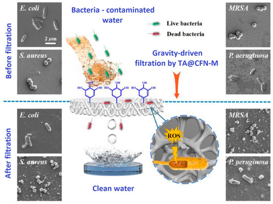 - Yu, R.; Wang, H.; Wang, R.; Zhao, P.; Chen, Y.; Liu, G.; Liao, X. Polyphenol modified natural collagen fibrous network towards sustainable and antibacterial microfiltration membrane for efficient water disinfection. Water Res. 2022, 218, 118469. [Google Scholar] [CrossRef]