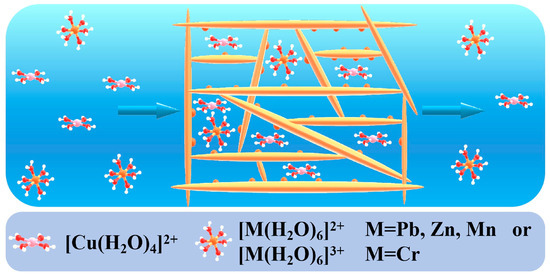 The functional groups—NH2 (Lewis base) and -COO− enhance Pb(II) and Cd(II) removal by coordination, respectively electrostatic attractions (Figure 2b); to increase the number of functional groups, gum copal CF was cross-linked with polyacrylic acid [45]. Similarly, Cr(VI) is adsorbed from wastewater on collagen-based porous aerogel; the ions of Cr diffuse in the porous structure of the adsorbent to coordinate with amino, hydroxyl and carboxyl groups (Figure 2c); since the synthesised aerogel had fluorescent properties, it can also serve as an indicator of Cr(VI) concentration [56].
