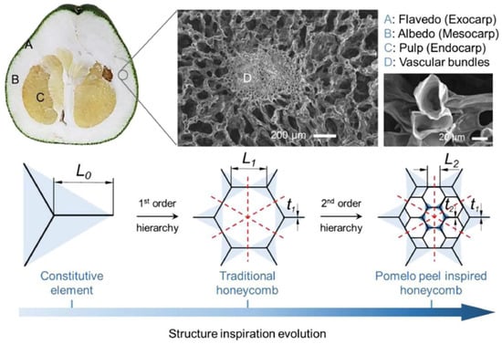 - Zhang, W.; Yin, S.; Yu, T.; Xu, J. Crushing resistance and energy absorption of pomelo peel inspired hierarchical honeycomb. Int. J. Impact Eng. 2018, 125, 163–172. [Google Scholar] [CrossRef]