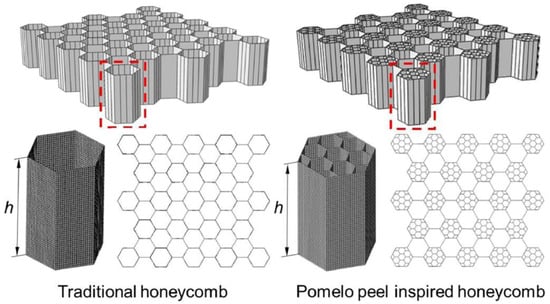 Finite element models of traditional honeycomb and pomelo peel honeycomb [38].
