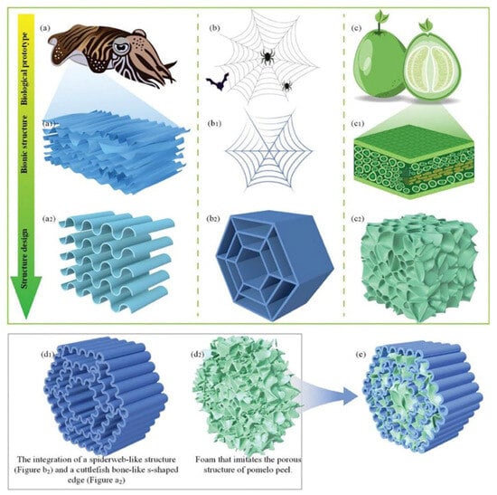 Biological prototypes and design strategies for the fusion of biomimetic designs. (a,a1) Schematic diagram of the S-shaped structure of cuttlefish bone. (a2) Bionic design of the S-shaped structure of cuttlefish bone. (b) Spider web, the second biological prototype used for integrated bionic design. (b1) Schematic diagram of the structure of spider web. (b2) Bionic structure of spider web. (c) Pomelo, the third biological prototype used for integrated bionic design. (c1) Schematic diagram of the porous structure of pomelo peel. (c2) Bionic design of the porous structure of pomelo peel. (d1) The integration of a spiderweb-like structure (b2) and a cuttlefish bone-like s-shaped edge (a2). (d2) Foam that imitates the porous structure of pomelo peel. (e) The S-shaped spider web integrated with porous foam to form a flexible composite of porous materials with an S-shaped spider web structure that was designed in this study [49].